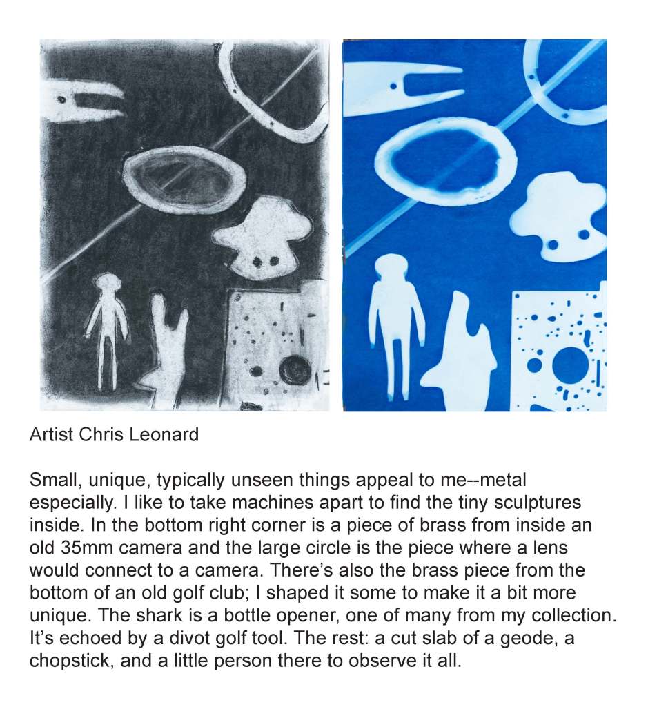 Their tour started in the exhibit with their instructor, and then the group moved to the educational studio on the second floor of the museum. Each artist brought their items with them, most carefully considered as they wanted to experiment and create. After the initial instructions and talking about the history and techniques of the cyanotype as an early photographic technique, each artist made several experiments trying different organic materials, salts, plants, peals, pens, fabrics, toys, miniatures, and many others.
