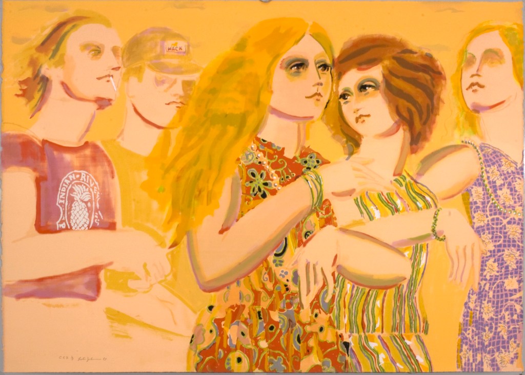 Lester Johnson was an abstract expressionist painter who used bold colors and forceful brushstrokes to create energetic figures and groups. Johnson’s color palette and subject matter shifted between the 1960s and 1970s from dark and somber male figures to bright and colorful groups that gave more emphasis to female figures. The flat colorful figures are packed together on one canvas to create a sense of company and aliveness. Johnson uses foreshortening to create a unique perspective of the gestural hands and cumbersome arms of each figure. He casually explained during a conversation with an art critic for The Brooklyn Rail that what led to this change in his work stemmed from a particular moment in time when he was leaving his studio in NYC and encountered his wife and young daughter, during which “the sky cleared and they were engulfed in a pool of sunlight.”