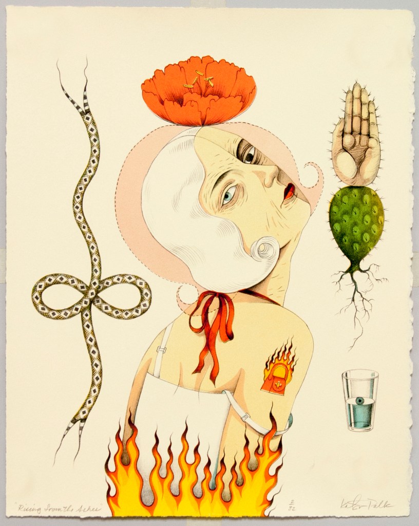 This print was created at Ohio University and gives many examples of these symbols. According to the artist, the title Rising from the Ashes directly comments on her decision to leave her business job and become an artist. The subject of the work is meant to be two, represented by the different eye colors and line down the center. She represents Polk and her sister, who were both going through significant life changes. Fire not only connects to her father being a firefighter, but also to the idea that fire can cleanse. The cactus represents one’s ability to withstand harsh conditions, while the hands with spikes represent fending off any outside restrictions. The purse is a symbol of fortune and money while the snake can represent two different personalities, one good and one bad.