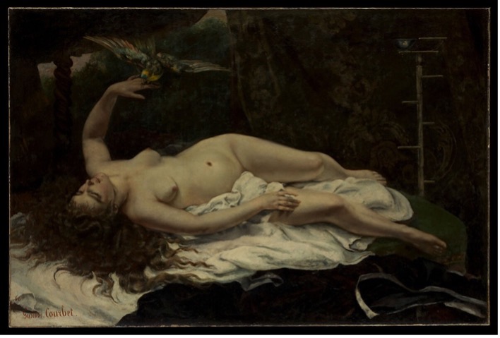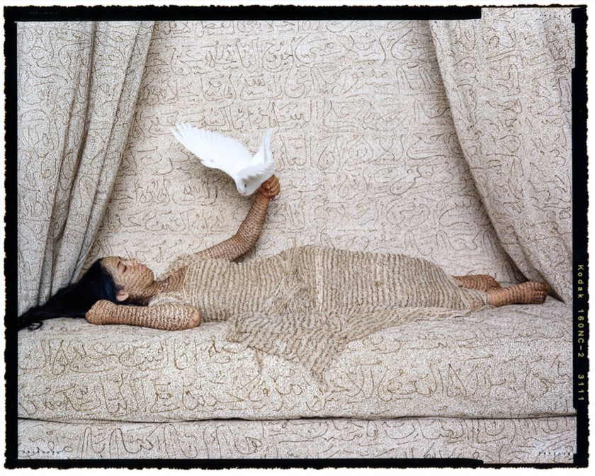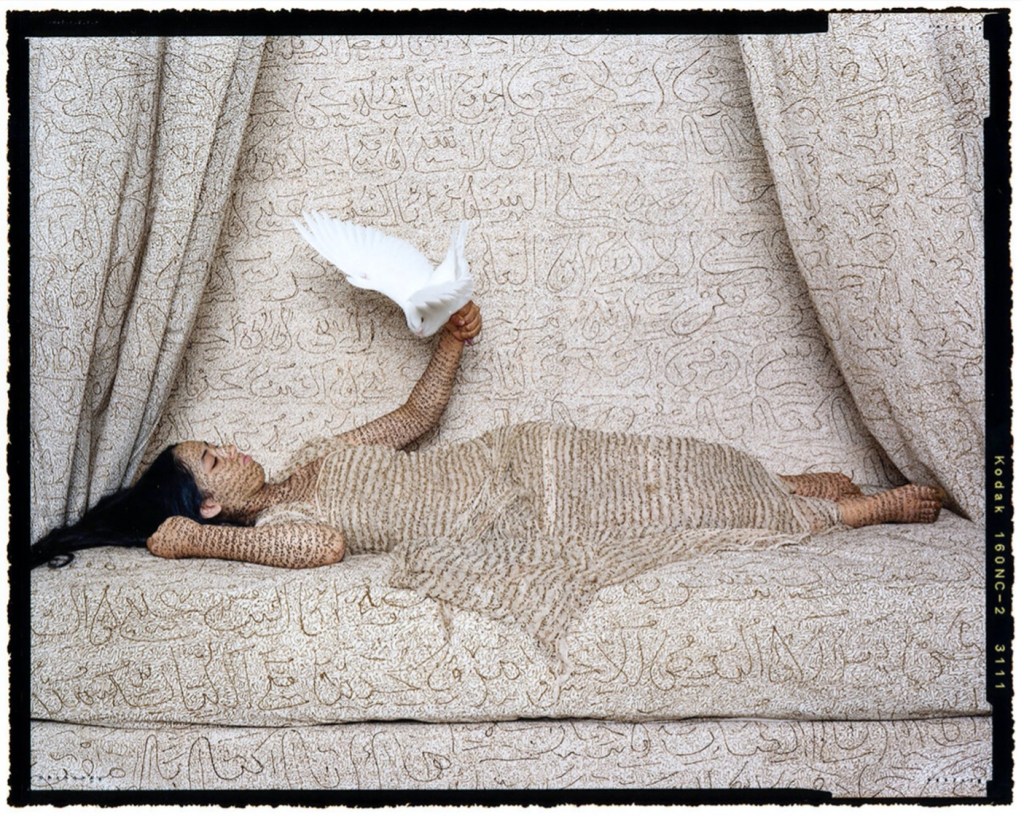 Essaydi works with the complexities of Arab female identity specifically in relation to Orientalism, a form of art in which European “male artists relied largely on hearsay and imagination [to depict] female slaves or concubines (many with Western features), reclining in the nude or in Oriental dress” (https://www.metmuseum.org/toah/hd/euor/hd_euor.htm). Essaydi specifically appropriates the poses and staging from these paintings to address the misrepresentation and hyper-sexualization of Muslim women. This is evident in the visual comparison of Les Femmes du Maroc: La Sultan and Gustave Corbet’s Woman with a Parrot, 1866 (see below). Pedrag Pandiloski, a staff writer for the Brown Political Review, states “Essaydi responds to these overtly sexual paintings by bringing back agency to the women, both in the way they are depicted and in the words [that] they are carrying on their faces. The contrast of the parrot in Courbet’s painting with the white dove in Essaydi’s photograph also has a strong message – while the former has strong exotic connotations the latter can be seen as women’s cry for peace in the Muslim countries in North Africa and the Middle East” (https://brownpoliticalreview.org/2015/05/les-femmes-du-maroc-lalla-essaydis-feminist-response-to-colonial-art/).