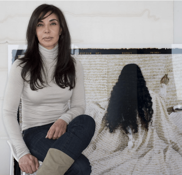 Portrait of the Artist, Lalla Essaydi, with “Converging Territories #10,” Lajos Geenen, 2009, digital photograph, https://sites.lib.jmu.edu/lallaessaydi/the-artist/