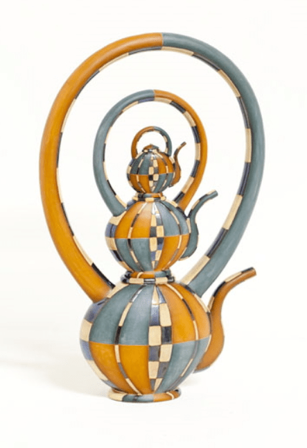 Gail M. Busch is a ceramicist from Tucson, Arizona. She attended the Kansas City Art Institute and pursued ceramics. Her love of traveling around the world with her partner, who is also involved with ceramics, has influenced much of her work. She is currently a professor of ceramics at Texas A&M University. Corsican is a way for Busch to incorporate her interest in multi-purpose vessels into the complexity of a teapot’s form. The form of this piece is valued over function, as Busch describes her work as ”fractal.” Corsican is a work that could be on the table.