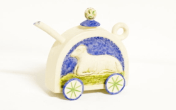 Marian Haigh is a ceramicist from Pittsburg, Kansas. She received a fine arts degree from Arkansas State University. She often builds ceramic vessels and teaches workshops. Her love of the natural world is prominent in her artwork, due to a childhood spent in nature and a rural cabin she keeps in Texas. Lamb on Wheels is a work that could be on the table.