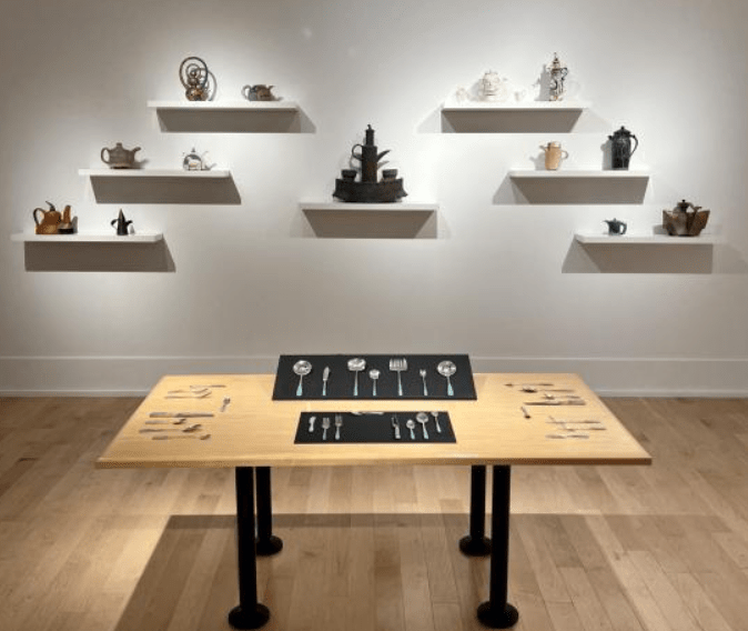 At/On the Table is a progressive installation from KMA collections. This installation seeks to consider the table as both a physical space and a metaphorical one. The objects included are those we might find on a table as well as representations of communication being expressed in a space. Tea sets are included, for example, but also portraits of people gathering around a table.
