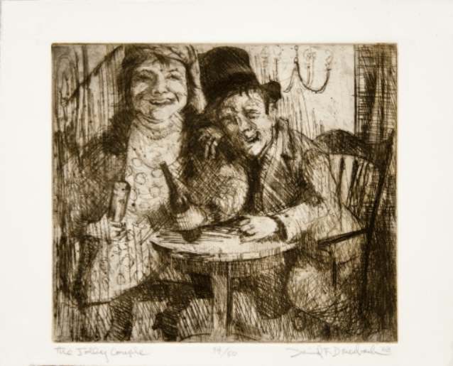 David Fraiser Driesbach was a printmaker originally from Wisconsin, before moving to Rockford, Illinois, in his early childhood. His mother was involved in the Rockford Art Association, which he often participated in as well, practicing still life and figure drawing. Due to WWII interrupting his college studies, he attended many different institutions, but eventually received both a BFA and an MFA from the University of Iowa. He was heavily involved with innovating and developing new printmaking techniques throughout his career. The Jolly Couple is a work that features people at the table.