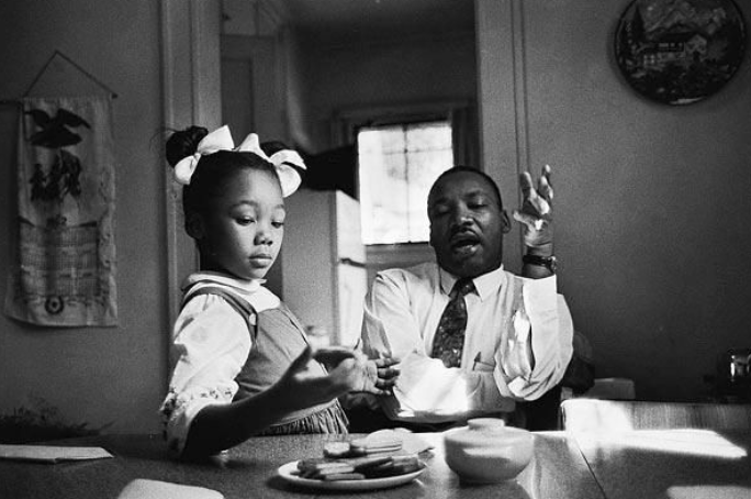 James Karales was a photographer and photo-essayist from Canton, Ohio. He received a BFA from Ohio University in 1955. He began to work as a darkroom assistant before being hired by Look magazine, where he went on to produce much of his more famous work. He may be best known for his work that captures scenes from the Civil Rights Movement. Specifically, he photographed much of Dr. Martin Luther King Jr. and his family life, after being given access in 1962-63. In this image, Dr. Martin Luther King Jr. is talking with his daughter about the color bar and segregation, which didn’t allow her to go to a local amusement park. Martin Luther King Jr. at Home with Daughter is a work that features people at the table.